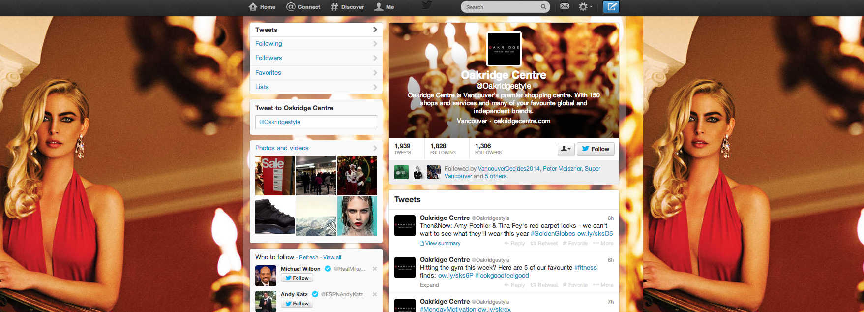 Leaving aside the perceptive dissonance between Oakridge the Mall and Oakridge the Pretty Lady, their tweets are quite diverse, sometimes linking to its Instagram or Pinterest pages (good), sometimes talking about #TuesdayShoesday (which I’m now aware is a thing), and sometimes just tweeting pictures of celebrities wearing stuff (not good).