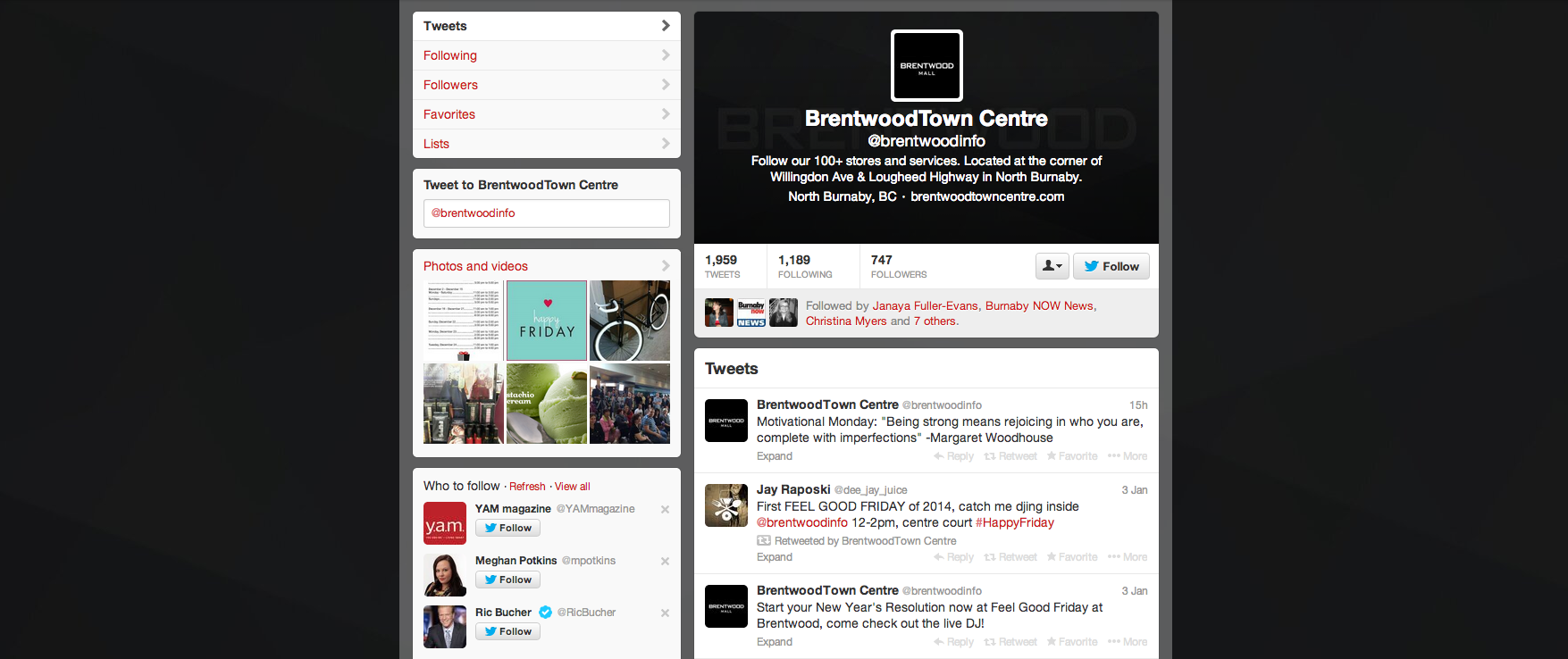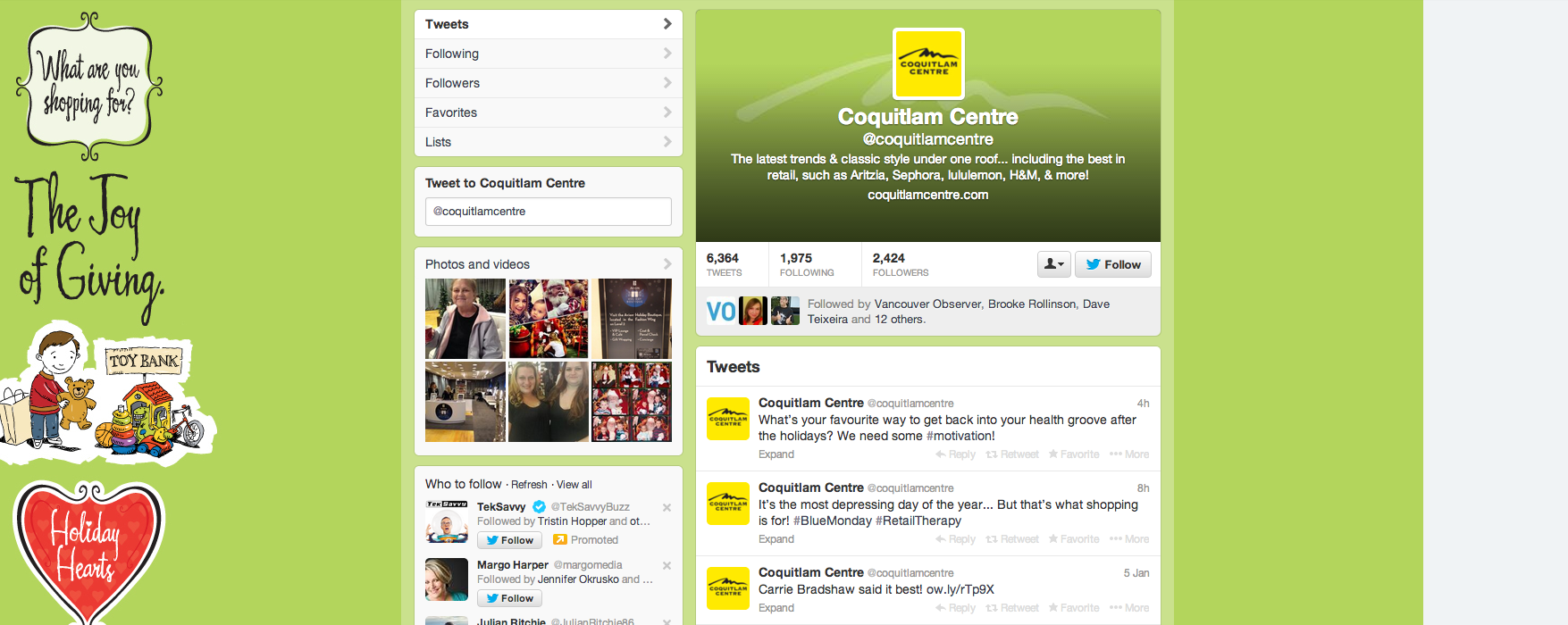 I think we could function perfectly well in the world without mall twitter accounts, but as that seems impossible, these will do. They retweet things from their tenants, make announcements about mall-wide sales and events, and answer customer complaints. It’s not rocket science, but these accounts alone fulfill those needs in the Metro Vancouver area.