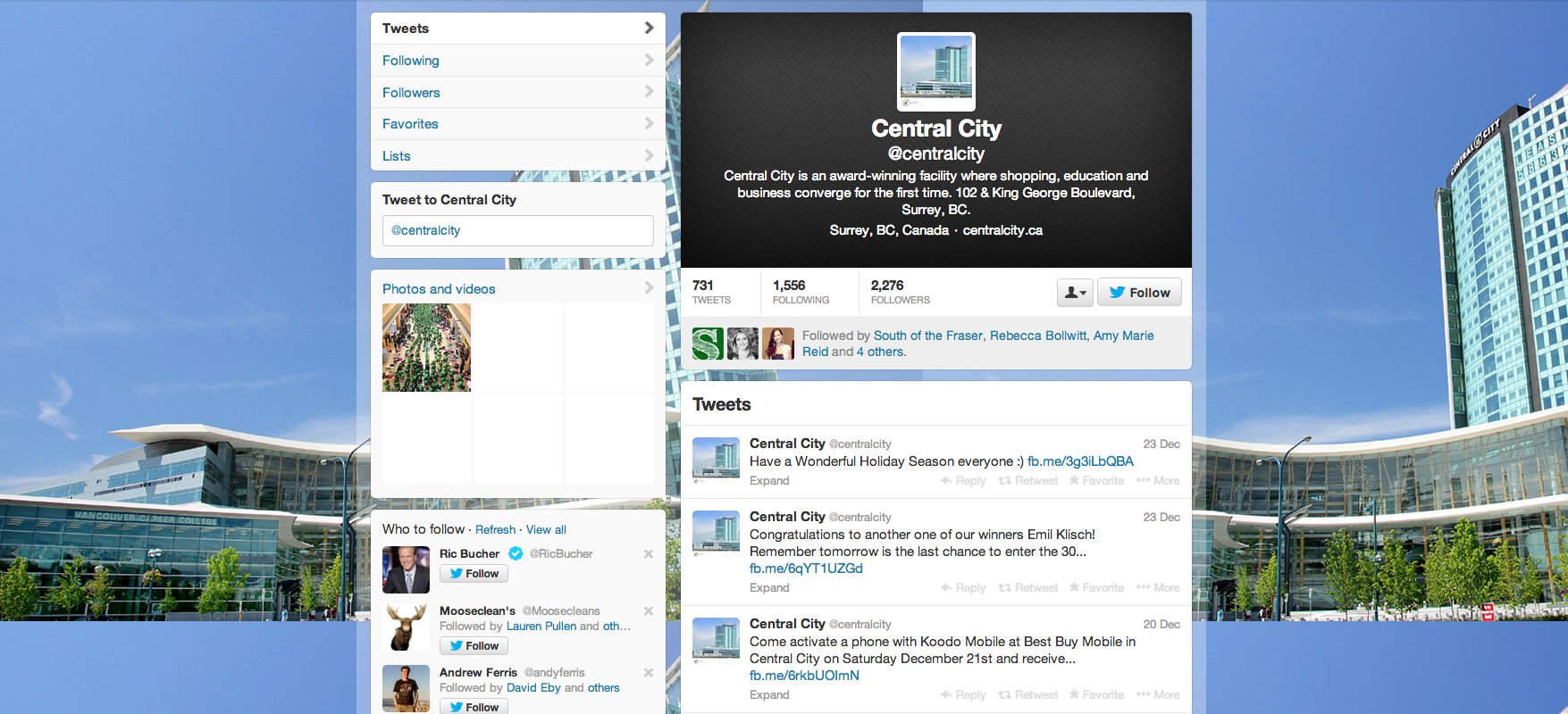 Central City Shopping Centre, or the Artist Formerly Known as the Surrey Place Mall, brands itself as “an award-winning facility where shopping, education and business converge for the first time.” Yet most of its tweets are Facebook links to an ongoing Mall contests or things happening in the Mall. Not a whole lot of convergence there, Central City.