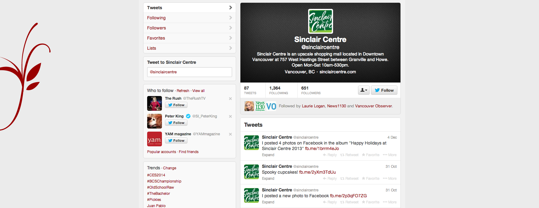 Sinclair Centre has tweeted 87 times in 46 months, and is no closer to understanding why it has a Twitter account. The majority of their posts are simply links to Facebook photo galleries, and the account has gone 6+ months without tweeting on many occasions.