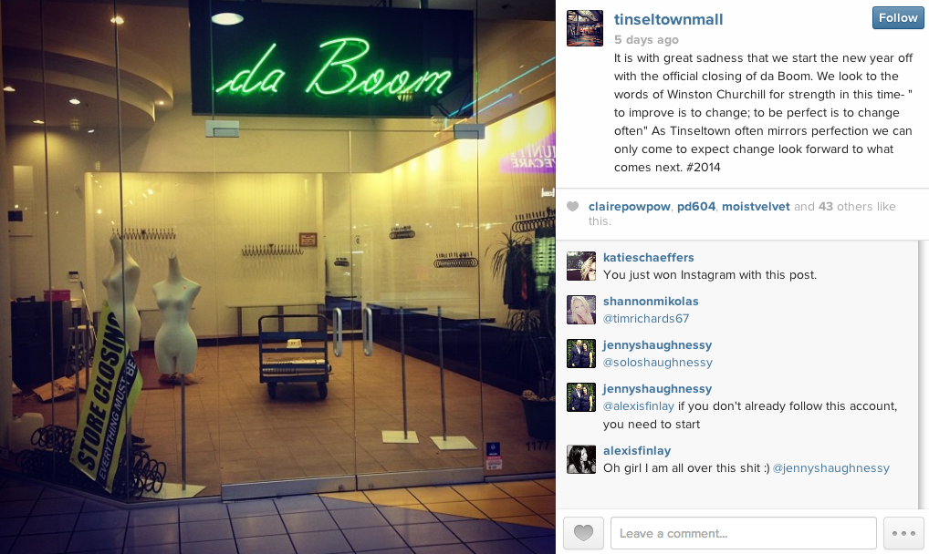 But these? Well, kudos, Vancouver. Your attempts at mall parody accounts are first-rate, finding the sweet spot between their inherent soullessness, the paradoxically chipper nature of corporate accounts, and the mediocracy of these particular outlets. Even better, these malls have no official accounts.