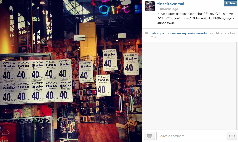 The Denman Mall account is just two days old, but already has the melancholy oh-what’s-the-point tone appropriate for an aging mall in the West End with no destination shops. Why did it start so late? Does it matter? Just check out their dollar store and be done with it.