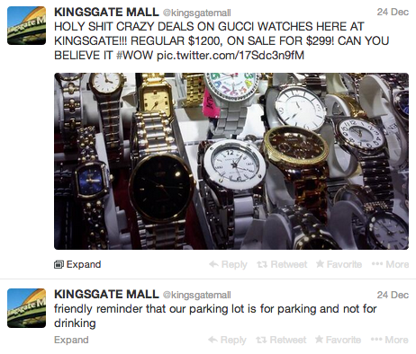 Guildford Mall is very active on Twitter, and most of the time, it sticks to retweeting things from its tenants, often preceded by some faux-enthusiasm. That’s good!