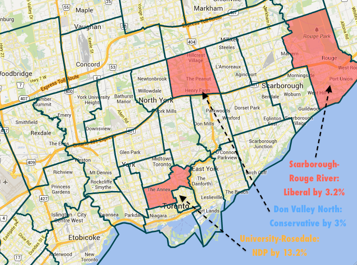 - And in Scarborough, the city’s eastern edge no longer has to share a riding with Pickering and gets its own district, Scarborough-Rouge Park, which would have gone to the Liberals in a tight three-way race (Liberals 35%, Conservatives 32%, NDP 31%) in 2011. The city’s five other districts all shrink and shift a bit westward, while the old Scarborough-Rouge River becomes Scarborough North, which will confuse no one.