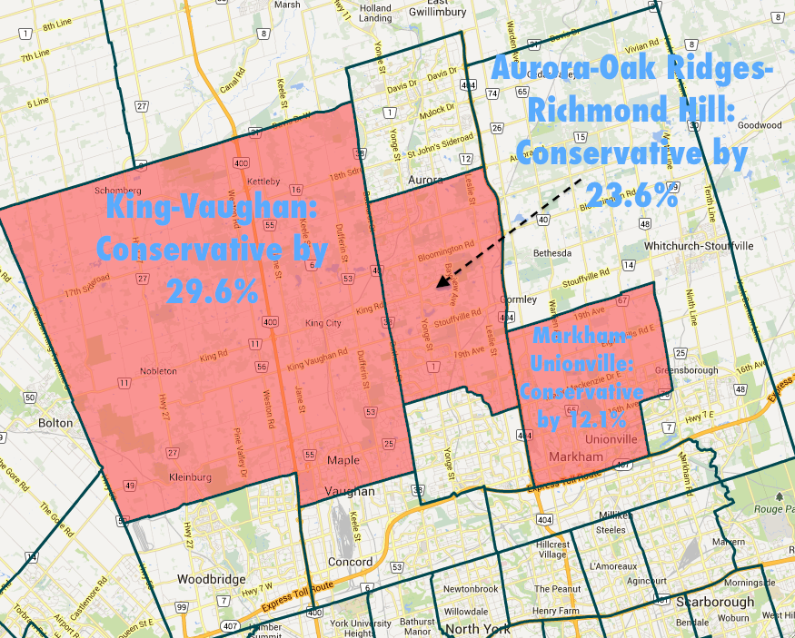 - The suburban area west of the 404 between Richmond Hill and Aurora becomes the verbose Aurora-Oak Ridges-Richmond Hill, and would have gone to the Conservatives by 23.6% last election.