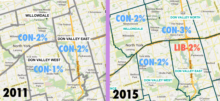 - In North York, Willowdale, Don Valley West and Don Valley East all shrink to create Don Valley North (East), which would have gone Conservative by 3% over the Liberals, 40.3-27.3%.