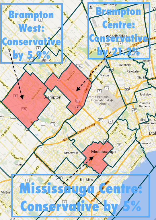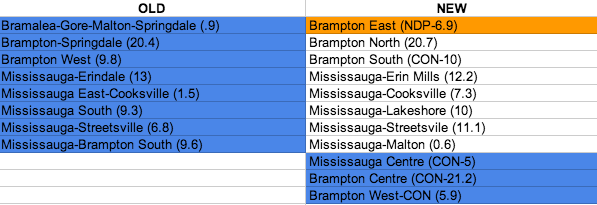 - Brampton West, which went to the Conservatives by 9.8% last election, splits in two, with Brampton South becoming a riding the CPC would have won by 5.9% over the Liberals, and Brampton West being one they would have won by 5.9%.