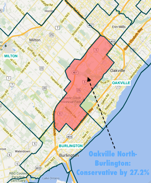 Where is the new seat?: Oakville North-Burlington is split off from the suburban-rural riding of Halton (renamed Milton), and would have gone to the Conservatives by 27.2% last election had it existed. It may have been in the news lately. Perhaps.