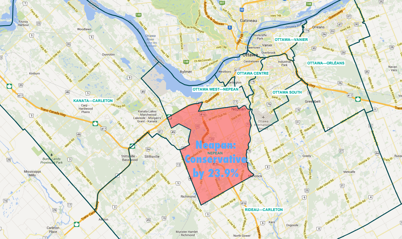 Where is the new seat?: Cut out from the heavily populated Nepean-Carleton (The Big Ottawa Suburb Riding to the South), the new seat of Nepean would have gone to the Conservatives by 23.9% last election.
