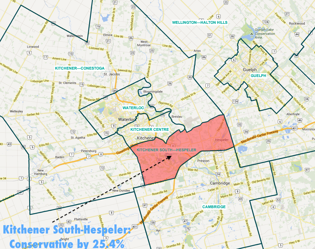 Where is the new seat?:The area between Kitchener and Cambridge has grown enough to get its own seat, Kitchener South-Hespeler, which would have gone Conservative by 25.4% last election.