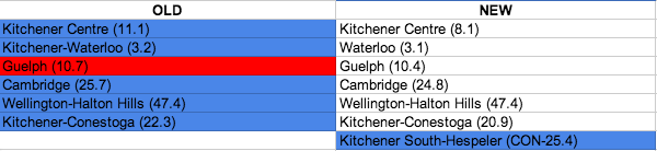 Geographical changes: The boundaries of Kitchener Centre shift a bit to the east, Cambridge and Kitchener-Conestoga lose a big of room for the new riding, and Cambridge gains a bit of farmland to the south to adjust. But things stay mostly the same.