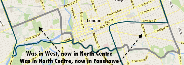 Geographical changes: Essex loses a bit of its eastern edge to the Chatham-Kent riding. In the three London ridings, there are the following changes to the boundaries on the north side of the Thames: