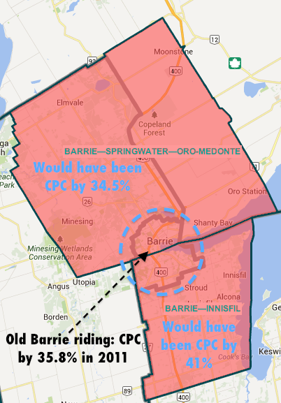 Where is the new seat?: Everything’s looking up Barrie! The city’s continual growth (from 38,000 in 1981 to 136,000 in 2011) means it gets split into two urban-rural ridings. This should please the Conservatives – where as they won Barrie by 35.8% in 2011, they would have won the two new ridings of Barrie-Springwater-Oro-Medonate and Barrie-Innisfil by 34.5% and 41% respectively.