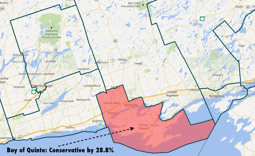 Where is the new seat?: The Trenton-Belleville-Prince Edward County area gets its own seat, named the Bay of Quinte. It would have gone to the Conservatives by 28.8% in the last election.
