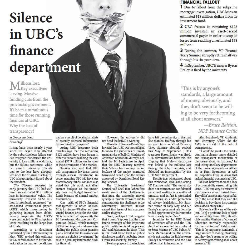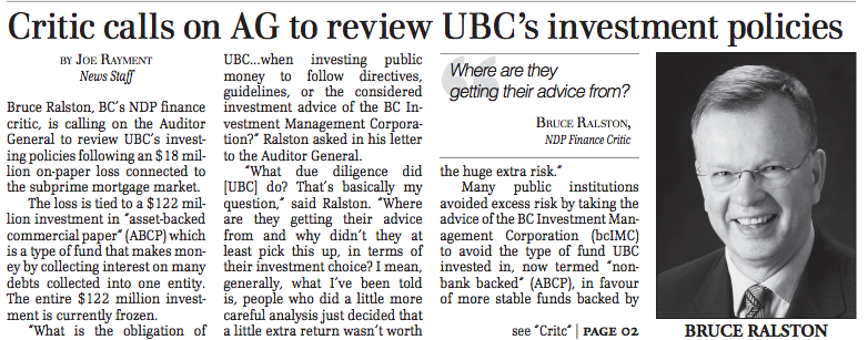 Nobody paid much heed to this until January 2008, when UBC quietly announced its endowment was $18 million poorer. Something about an $122 million investment in “asset-backed commercial paper”, directly connected to subprime loans in the U.S.
