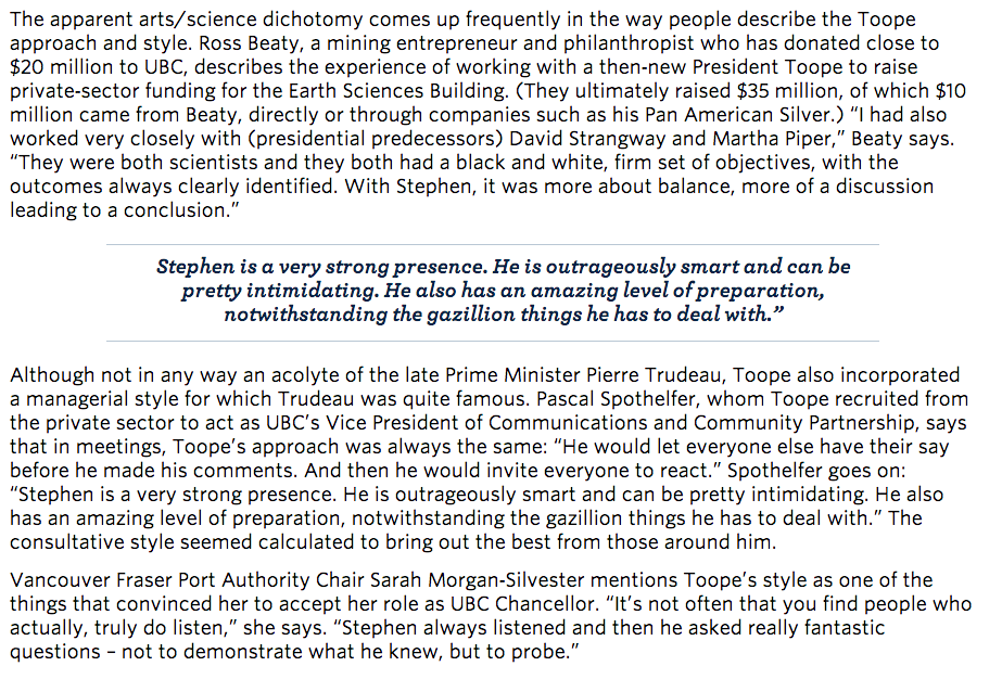 Toope’s trust in Ouillet on UBC’s financial restructuring was consistent with how he dealt with many issues. Find a capable executive, get in front of a topic, and don’t let it linger too long.