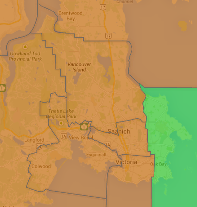 Another option is in the Victoria region. The five ridings completely in the Capital Regional District are under the provincial average and could be reduced by one without any real difficulty.