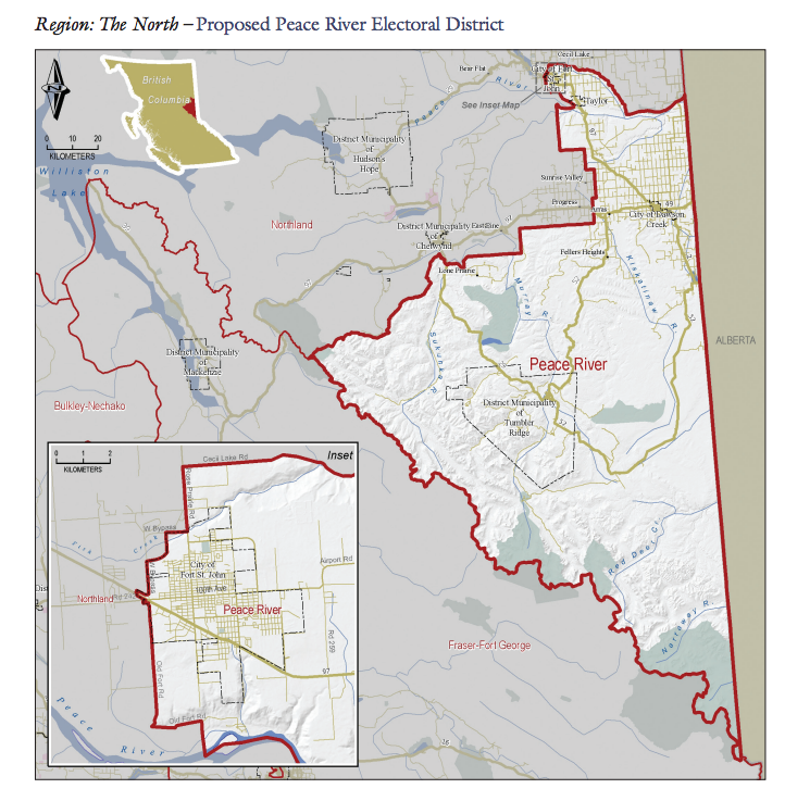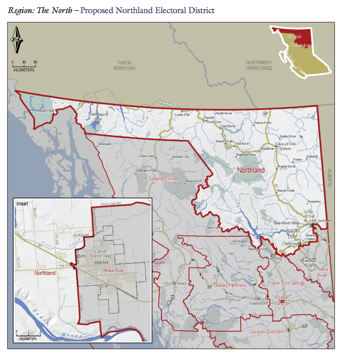 It was just last decade that an electoral commission had similar thoughts. In 2007, the Electoral Boundaries Commission proposed that if B.C. continued with individual ridings, the North should get a radical makeover. They said Prince George should get its own, completely urban riding. They proposed that all of the major Peace River Regional District towns, save for Chetwynd, should be part of the same riding. And they said the far reaches of northern B.C., whether in the east or west, should be part of the same vast riding called…oh, let’s say “Northland”.