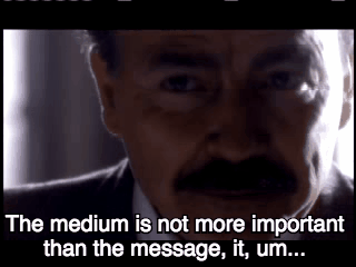 A seminar is wrapping up, and he’s rambling as students leave his class. A student asks “are you telling us the medium is more important than the message that it carries?”