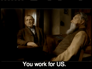 Powerful White Man is upset about something. Next to him is a guy we’ll call Crazy Beard. He’s quiet. Too quiet.