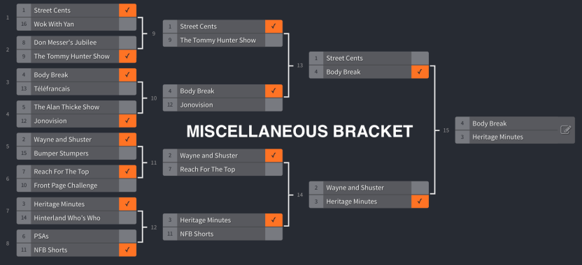Body Break: defeated Téléfrancais (85% of the vote), Jonovision (77%), Street Cents (57%, Body Break is the Jonathan Torrens bracket buster)