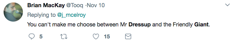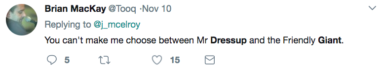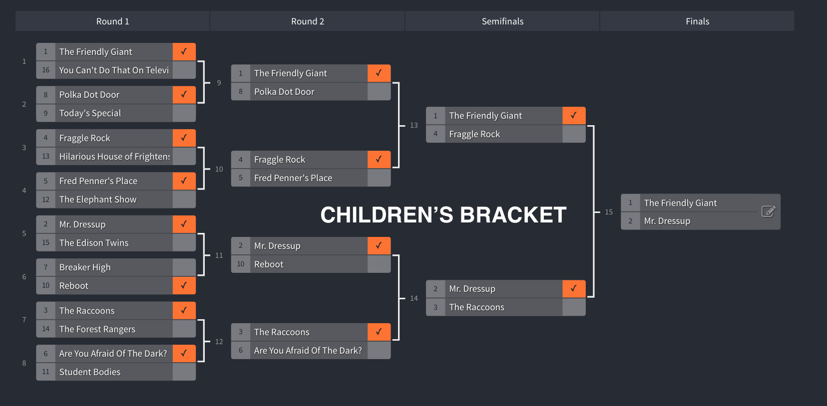 Now, I could be wrong! But Dressup has been stampeding through the children’s bracket of nostalgia overload matchups in massive blowouts, while The Friendly Giant has gotten workmanlike wins, but nothing more.