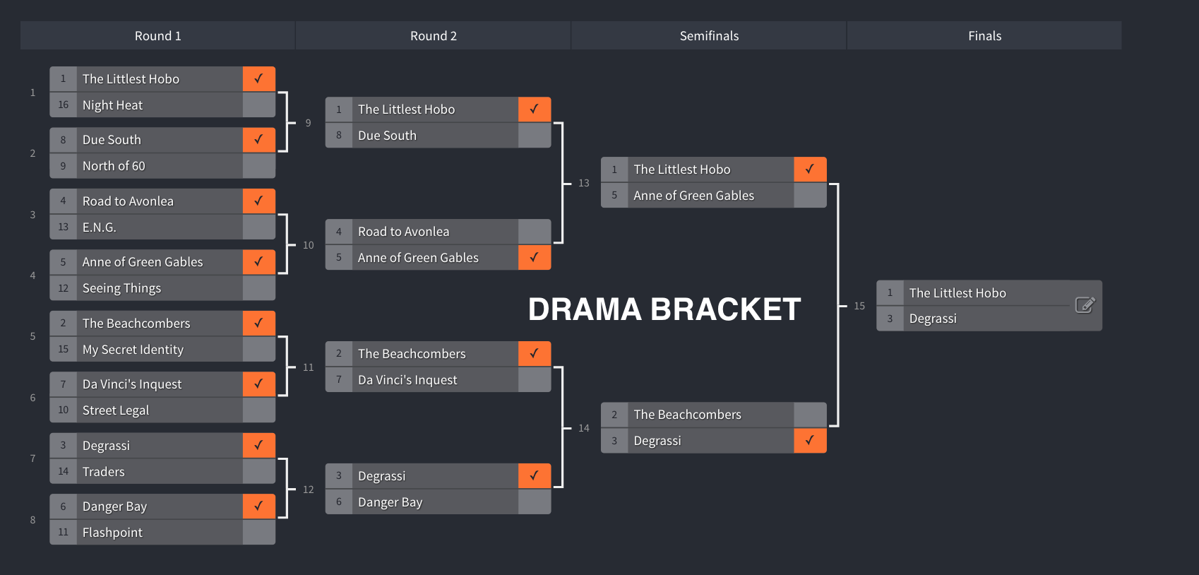 Littlest Hobo received 56% over Anne of Green Gables, while Degrassi received 54% against the Beachcombers. So this is unpredictable, but I have a feeling that most people will have pretty strong feelings for one or the other, but not both.