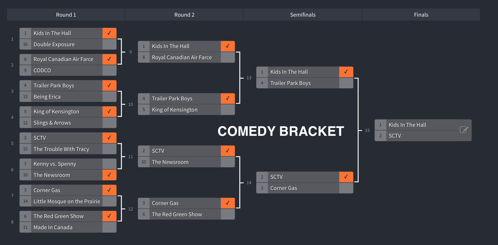 But here in the Elite Eight? We’re deciding what the memorable comedy, drama, and children’s show in Canadian history is.