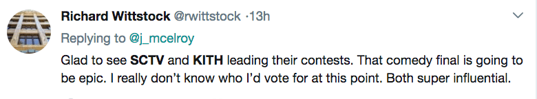 I’m wondering about the voter demographic. Being 50 SCTV is embedded in my brain more than KITH much as I liked them because I grew up with SCTV. People a decade younger than me might have the same response to KITH.