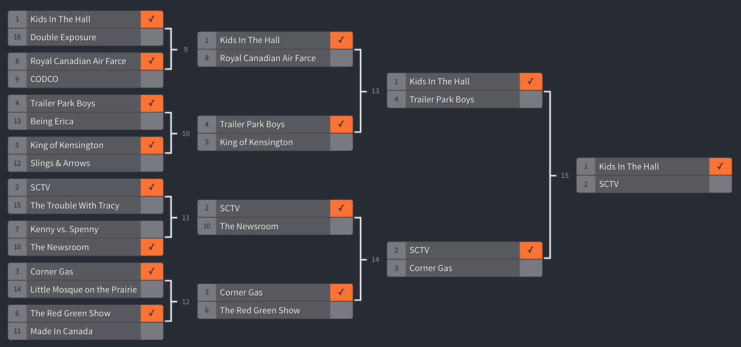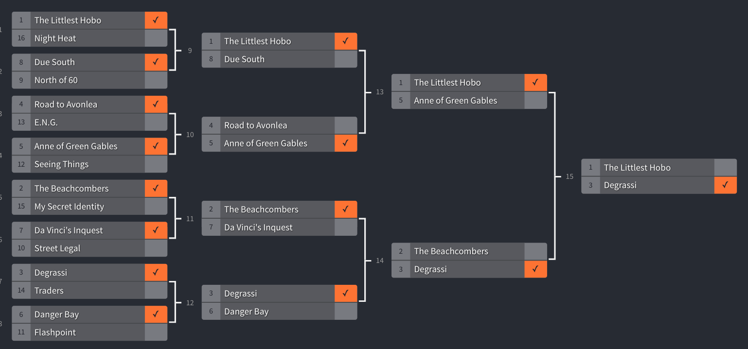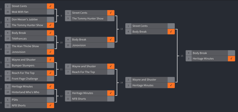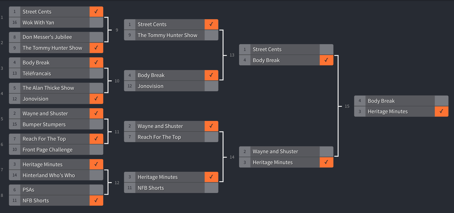 Sad to see Definition wasn’t there but Bumper Stumpers was a good choice; you could do a whole bracket of hokey Canadian game shows. It was fun to see The Trouble With Tracy (I love SCTV, but I’d have voted for her), and congrats to the Hobo for his strong run.