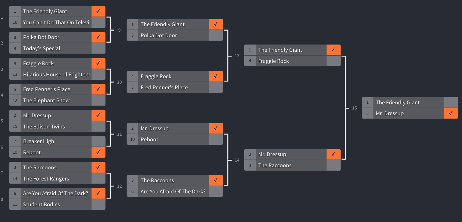 There’s been one thing through this entire tournament that has dominated, never getting less than 75% of the vote, and that’s Mr. Dressup. And the show has done it against four very different types of programs: Edison Twins (80s nostalgia), Reboot (90s CGI), The Raccoons (animated Canadiana) and The Friendly Giant (Canadian Education Writ Large, I’M SORRY I FAILED YOU BOB HOMME)